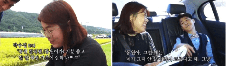 매니저 박수정 씨가 새엄마라는 소문에 대해 언론과의 인터뷰에 나선 정동원 아빠 정용주 씨는 "가족관계는 솔직하게 말하겠다. 오래 전 할아버진 생전부터 가족처럼 지냈던 사람이고 무엇보다 동원이가 엄마를 너무 잘 따른다. 하동에 내려오면 엄마하고 같이 자려고 하고, 모든 일을 엄마한테 먼저 의논을 하고 그 다음에 저한테 상의를 한다. 그만큼 동원이가 너무 엄마를 잘 따르니까 그게 참 감사하고, 동원이가 엄마 덕분에 많이 밝아졌다"고 고백합니다.