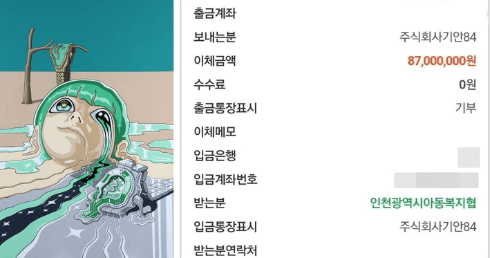 기안84는 지난 첫 전시회에서 모든 그림을 완판시킨 것으로 전해졌죠. 그리고 첫 개인전 수익금 8700만원을 아동 복지 협회에 전액 기부했다는 훈훈한 소식이 전해졌습니다.